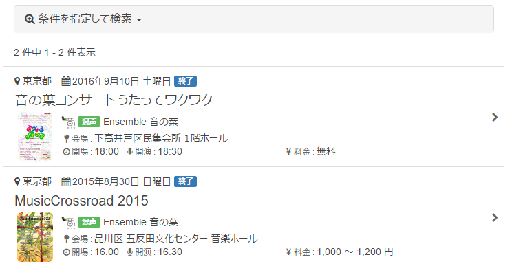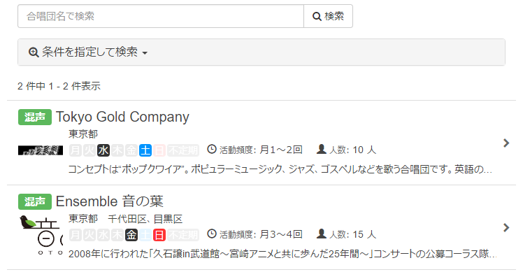 地域や活動日で条件を指定して検索。マイグループ機能を使っている合唱団なら、実際にどれくらい活動しているのか、どんな曲を歌っているのかも確認してから見学に行けます。