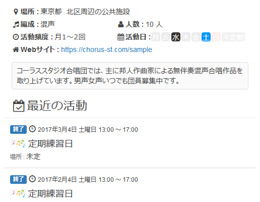 団内の情報共有にグループウェア、外部への宣伝にホームページと別々に更新するのが大変ではありませんか?Chorus Studioでは、練習日程や取り上げている楽曲を管理しながらそのまま情報公開することができます。