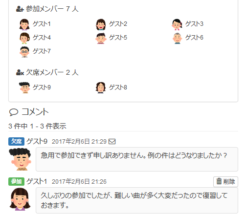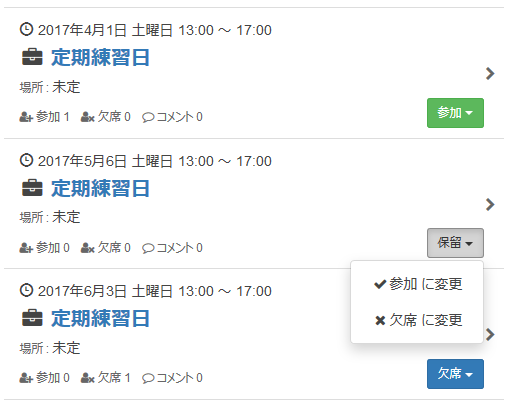 「明日の練習、何人集まるんだろう…」Chorus Studioなら、日程一覧画面から簡単に参加表明と人数確認ができます。